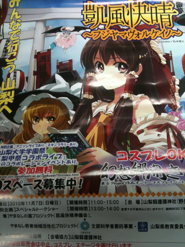 いってきました山梨県!! いってきました護国神社!! まぁ、てっさ地元ですけどねww c-3にて、洋月堂さんからの委託本、「瞬過愁透」を頒布して来ました。 今回、初めてのサークル参加でしたが、とっても楽しかったです!! ビバ、もこたん!! 今回、予定していたCDを持っていけなかったんですが、 「あれ、今日CDないんですか?」 って聞いてくれて、とっても嬉しかったです!! なきそうになったww 帰りに、ポスターもらいました んで、今回の収穫 そして、お隣様にいただいたものです 廚②病原菌さん、大変屋さん。 ありがとうございます!! さて、今回頒布した「瞬過愁透」の続頒情報は yougetsudou.web.fc2.com/ 洋月堂(新月 秋刀魚 洋々) にて発表されると思います それではでわ |